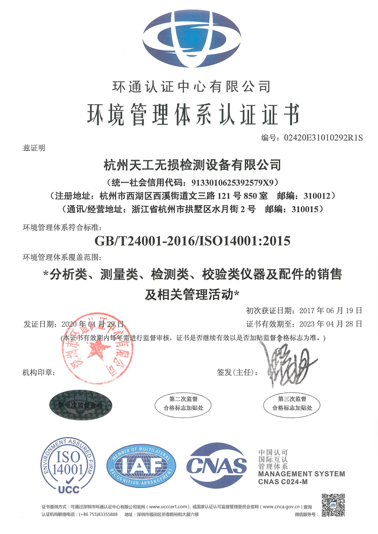 環(huán)境管理體系認證證書